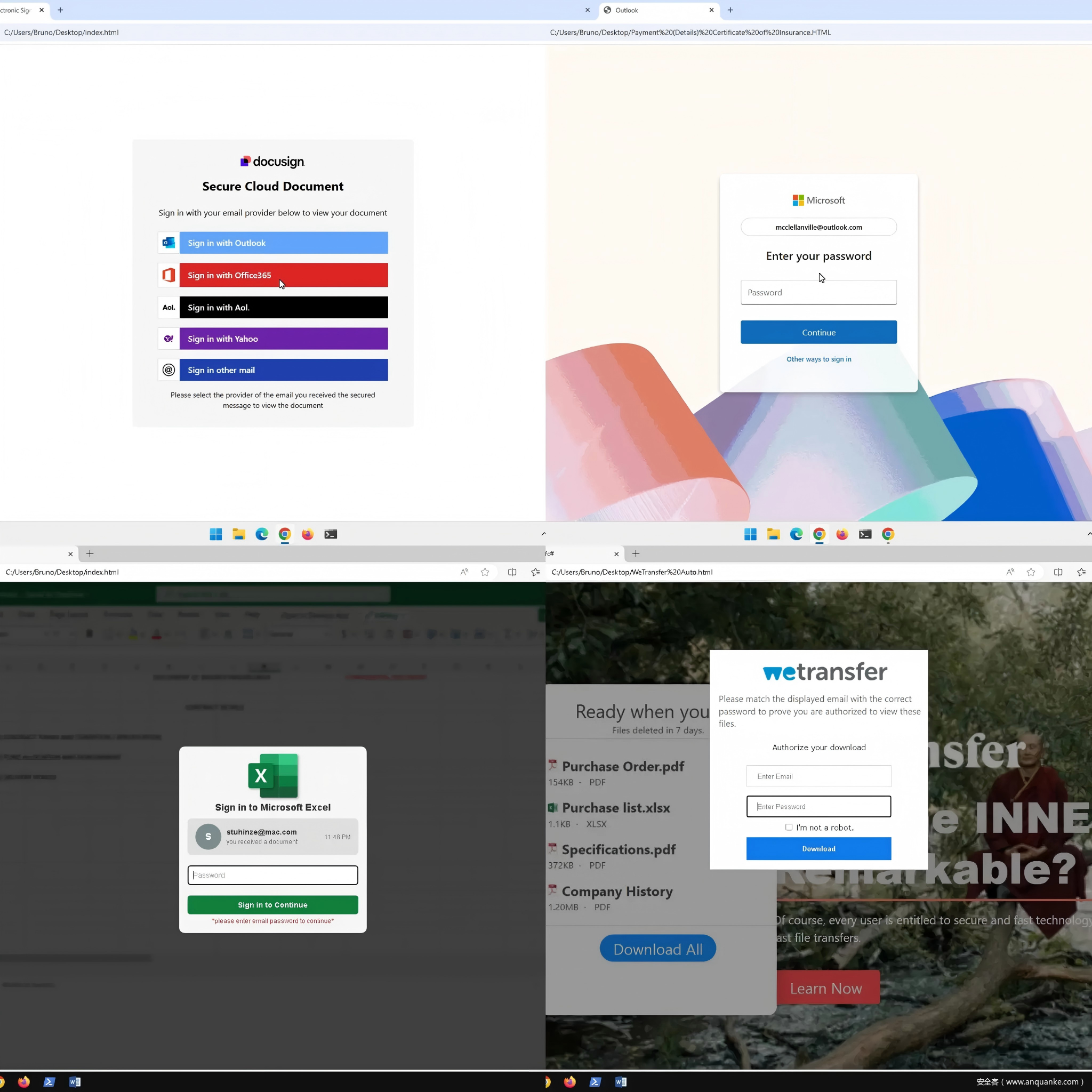 钓鱼邮件通常伪装成业务信函,例如报价请求(RFQ)或发票确认,诱使用户打开看似文档的附件。实际上,这些附件是独立的 HTML 页面,被精心设计成酷似合法的 Adobe 登录界面。